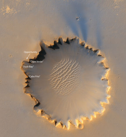 Scientists will use this detailed aerial view to guide Opportunity’s descent into the crater, says rover principal investigator Steve Squyres of Cornell University.