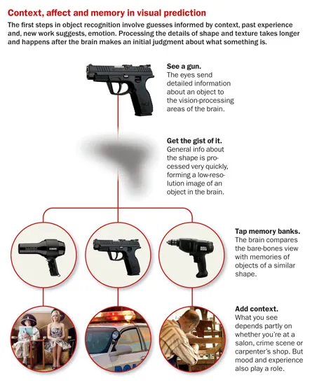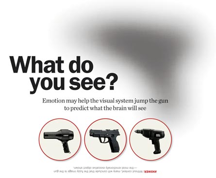 It takes a few hundred milliseconds for the brain to come to a final decision about what the eyes see. But some basic information about an object — its shape and position in front of the viewer — are sent to the brain at warp speed. The general shape of a gun, for example, is similar to that of a hair dryer or power drill. Only with the additional processing time will the brain be able to confirm which of the three it is looking at. In the meantime, the get-it-quick part of the brain’s visual-processing system can send enough information for the brain to take a good, if not always correct, guess at what it’s seeing. This guessing process, called visual prediction, is attracting attention from scientists interested in understanding if and how emotion influences visual perception.