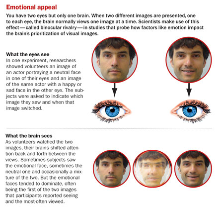 In binocular rivalry studies, two different images are shown to a viewer, one image to each eye. Since the brain normally sees only one object at a time, attention switches back and forth between the two images. But in studies in which one of the two objects evokes an emotional response while the other does not (say, a fearful face and a neutral one), the evocative object holds the brain’s attention longer. People actually report seeing that object more often than the neutral one. Writing in a 2006 issue of Cognition and Emotion, Georg Alpers and Paul Pauli of the University of Würzburg in Germany showed that objects associated with a positive or negative affect were seen first and for longer periods of time in the binocular rivalry studies than objects that evoked no emotion.