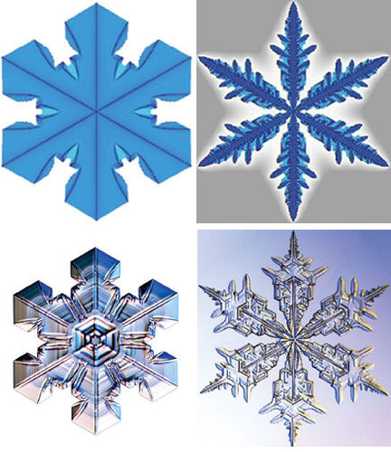 The most striking signs of that authenticity, Griffeath says, show up in comparisons between intermediate stages of simulated snowflake growth and of lab-grown crystals filmed by Libbrecht and others. The similarity suggests that the simulations replicate not just the ultimate appearances of the snowflakes but also the processes that yield those final shapes.