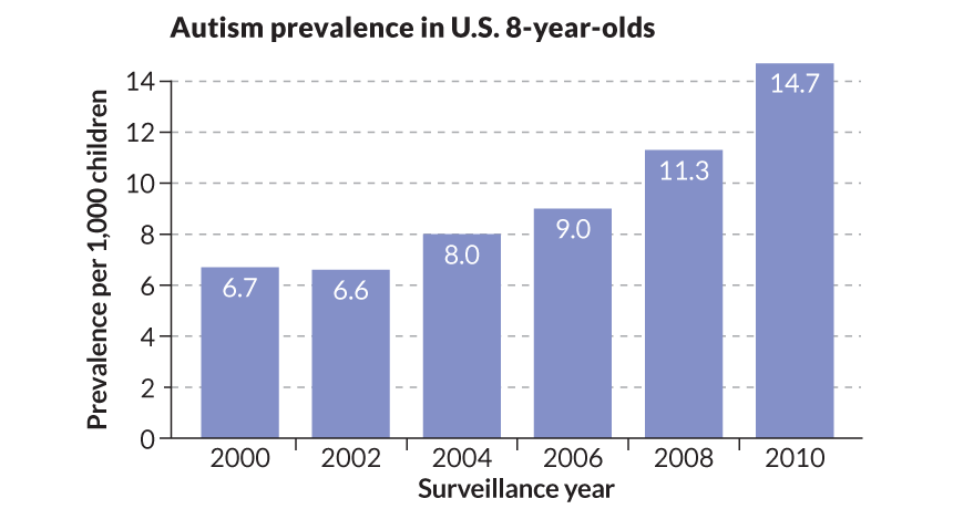 The number of 8-year-olds with an autism spectrum disorder rose from 1 in 88 (or 11.3 per 1,000) in 2008 to 1 in 68 (14.7 per 1,000) in 2010, the U.S. Centers for Disease Control and Prevention estimates.