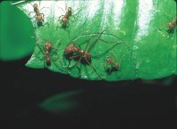 The same line of research on leaf-cutter stridulation revealed a related function: an invitation to hitchhikers. When the ants forage, the smallest workers, or minims, swarm along even though they’re too little to do any cutting. They scurry around the cutting site or stand nearby with mandibles open and antennae outstretched. Many don’t walk back to the nest on their own but literally hitchhike on the loads carried by the bigger ants.