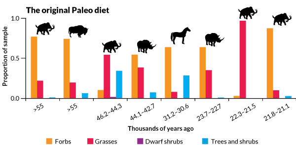 To find out what prehistoric animals were eating, Willerslev and his colleagues analyzed plant DNA from the guts or fossilized feces of eight large herbivores that lived between 55,000 and 21,000 years ago: four woolly mammoths, two woolly rhinoceroses, a bison and a horse. None of those animals roam the Arctic today. The ancient herbivores dined largely on forbs, the researchers discovered. About 63 percent of plant remains in the samples were forbs, with grasses comprising about 27 percent.