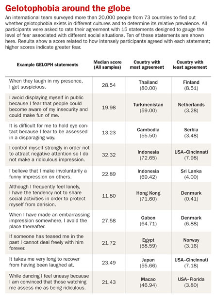 GELOPH testing in dozens of countries shows that the fear of being laughed at is everywhere, says University of Zurich psychologist René Proyer, who directed a multinational study on the subject. Though scientists are still sifting through the data, preliminary findings show that the incidence of gelotophobia is especially high in Asia, where the concept of “saving face” is important. The results were published in the February issue of the journal Humor.