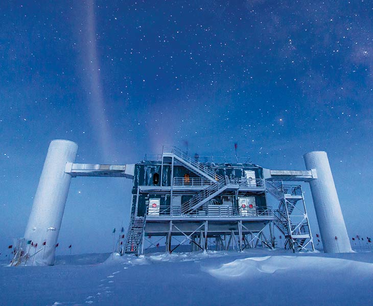 With light sensors sunk kilometers deep into the ice sheet, IceCube’s detector is so huge that it could pick up traces of a million neutrinos from a Milky Way supernova. Because it was designed to capture only the highest energy neutrinos that are rocketing through space, it’s not sensitive enough to detect individual neutrinos emitted during a supernova. Instead, IceCube’s focus is on the big picture: It catalogs an increase of light in its detectors produced by neutrinos interacting in the ice in time slices of two billionths of a second, says IceCube leader Francis Halzen of the University of Wisconsin–Madison. “We make a movie of the supernova.”