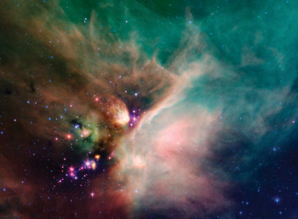 Some 300 young stars shine through the dust in this infrared portrait of the main cloud of a nearby star-forming region called Rho Ophiuchi. (When viewed in visible light, the stars remain hidden in the dust.) In this false-color rendition, red indicates stars only a few hundred thousand years old, so young they still reside within the cocoons of dust and gas from which they grew.