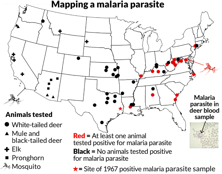 Testing has discovered the malaria parasite in populations of white-tailed deer, mainly across the southeastern United States, as well as in mosquitoes in the Washington, D.C., area. Deer in other parts of the country, as well as some elk and pronghorns, tested negative for the parasite (inset).