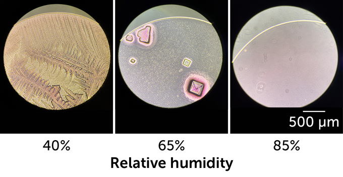 At low humidity levels, airborne droplets, or aerosols, dry quickly (left), preserving viruses under a feathery crystalline lattice, as this microscope image shows. At intermediate humidity levels, crystals form inside liquid droplets (middle), but those crystals may inactivate viruses, not preserve them. At high humidity levels (right), aerosols remain liquid, allowing viruses to survive better than at midlevel humidity.