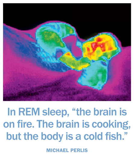 In the first four stages of sleep, heart rate, body temperature and brain activity drop, supporting the view that sleep serves to save energy. But then REM comes along. During REM sleep, the body becomes paralyzed, which keeps people from acting out their dreams. Although the body is still as stone, the flight-or-fight response system is in overdrive, says Michael Perlis of the University of Pennsylvania in Philadelphia. Brain activity is as high or sometimes even higher than during wakefulness. “The brain is on fire,” during REM, Perlis says. “The brain is cooking, but the body is a cold fish.”