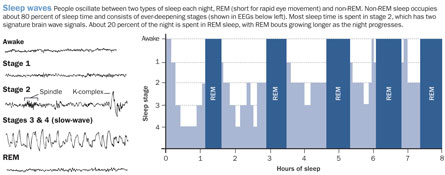 occurs in the other sleep stages, too. These stages are repeated in roughly 90-minute cycles throughout the night, with more slow-wave sleep early on and more REM toward morning.