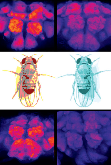 To test the hypothesis that sleep alters metabolism, Amita Sehgal and Susan Harbison of the University of Pennsylvania left the lights on for some fruit flies. Each night for a week, the light deprived the flies of about two hours of sleep. Males made up for the loss by sleeping far more than usual the next day. Most females, though, just lost sleep and didn’t make up the difference. The researchers also perturbed the flies’ sleep by mechanical stimulation, which involved randomly jerking the flies’ test tubes. Other flies were bumped while awake during the day, but their sleep was not disturbed.