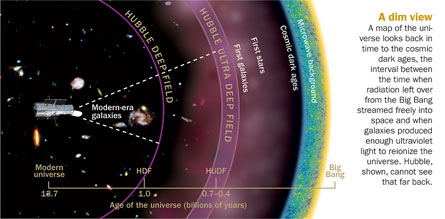 Another group of telescopes promises to help astronomers fill a glaring gap in the cosmic photo album. Images of the cosmic microwave background, the radiation left over from the Big Bang, provide the earliest snapshots of the cosmos—from when it was only about 400,000 years old. Flash forward to the next series of images, which show what some of the first galaxies looked like when the universe was about 850 million years old. The era in between—before stars and galaxies were born—remains a mystery. It’s during these cosmic dark ages that “the primordial soup evolved into the rich zoo of objects we now see on the sky,” says Avi Loeb of Harvard University.