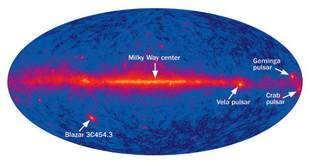 The telescope will have to distinguish gamma rays produced by decaying dark matter from those generated by supernovas and hot gas around black holes. Preliminary results are expected to be announced later this fall. Already, the Fermi observatory has recorded for the first time very high-energy radiation from gamma-ray bursts, the ephemeral blasts believed to signal the collapse of massive stars into black holes (SN: 1/17/09, p. 5).The observatory has also discovered a new class of pulsars that appears to emit only gamma rays (SN Online: 12/8/08) and created new maps of the cosmos’s gamma-ray background.