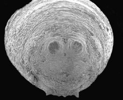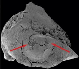 THEN AND NOW. A fossil pupa fragment (above) found in Antarctica has a pair of spiracles, or breathing holes, (arrows) which marks its species as similar to modern blowflies (pupa, below).
