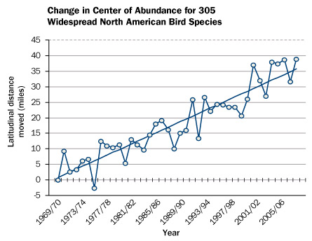 Those shifts dovetail with warming trends in winter temperatures recorded by state during that time, says Audubon scientist Greg Butcher, coauthor of the report. Overall the wintering grounds of the birds have shifted an average of 56 kilometers (35 miles) north in cold months during the past four decades.