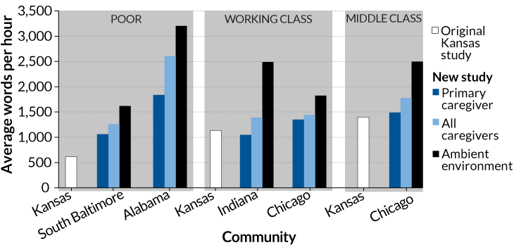 Primary caregivers in poor, black Alabama families directed an average of 1,838 words per hour to their children, close to the corresponding figure of 2,153 words per hour for high-income, white caregivers in Kansas in the original word-gap study. The earlier study reported that primary caregivers on welfare in Kansas spoke an average of 616 words per hour to their children, about one-third the total spoken to poor, black children in the new study. Primary caregivers from working-class and middle-class families in the new study uttered an average of 1,048 to 1,491 words per hour to youngsters.