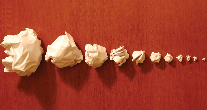 PAPER TOSS When sheets of paper were scrunched, variations in surface area (larger on the left) led to balls with different levels of crumpled folding. Surface area is one part of a new equation that may help describe how brains fold.