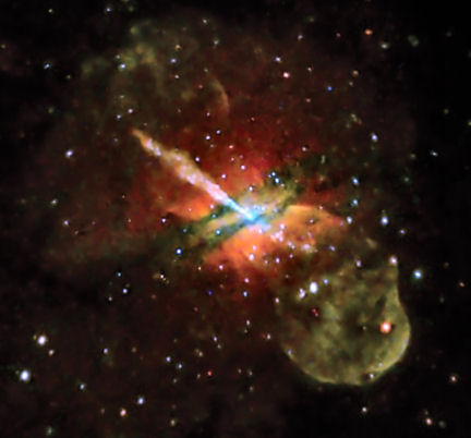 Jets of energetic particles shoot out from a supermassive black hole in the deepest X-ray image ever taken of the galaxy Centaurus A, 11 million light-years from Earth. In this 199-hour portrait, recorded with NASA’s Chandra X-ray Observatory, red denotes the lowest-energy X rays, blue the highest.