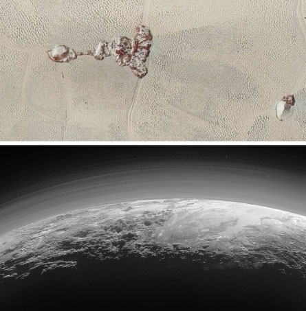 So much about Pluto is alien to Earthlings. On a world where a warm day is about −220° Celsius, the bedrock is made of hardened water ice. But there’s also something oddly familiar: Pluto has blue skies. Layers of haze stack on top of one another to build a tenuous atmosphere (SN Online: 10/15/15). The haze scatters sunlight into the nightside, teasing researchers with glimpses of odd landforms faintly illuminated in Pluto’s twilight. Within that atmosphere, ice moves back and forth across hemispheres through the interminable seasons. It appears to snow on Pluto.