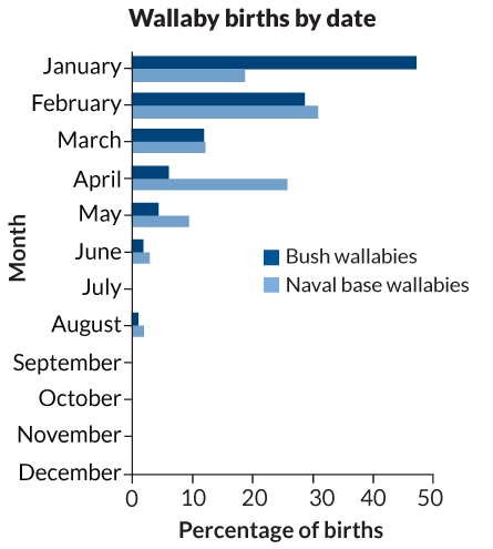 For Tammar wallabies exposed to artificial light at night, birthing peaks in February, a month later than normal. Moms with joeys born too late face food shortages as greenery fades.