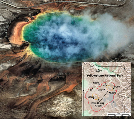 From mid-2004 through 2006, parts of the terrain in Yellowstone National Park rose as much as 7 centimeters per year, a rate about three times that previously measured. Analyses suggest that the rapid uplift results from the flow of molten rock into a Los Angeles–size zone of strata beneath the park.