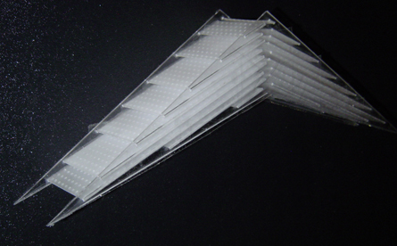 To manipulate sound waves in air, Cummer’s team designed and built a cloak that sits atop an object like a piece of draped carpet. By layering simple metamaterial building blocks — ordinary strips of perforated plastic — the researchers hid a triangular wooden block a couple of inches high and more than a foot long at its base.