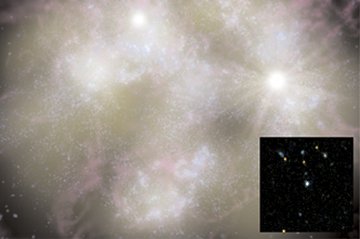 SKY DIAMONDS. Artist’s depiction of one of the newly found baby galaxies. Inset: Some of the newly detected galaxies found by the Galaxy Evolution Explorer satellite.
