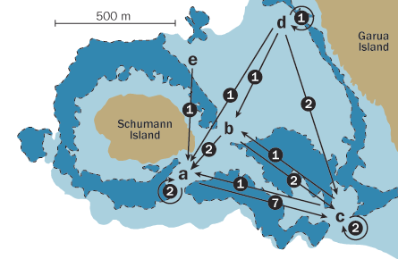 For shallower species, molecular tagging has yielded more direct evidence. The results are shaking up a long-standing assumption that since many species occur widely, their larvae must also travel widely. Some larval damselfish dosed with tetracycline, which leaves a mark on their ear bones, later set up housekeeping in their native home reef off of Australia’s Lizard Island. And a bunch of clownfish settling in a stretch of Kimbe Bay in Papua New Guinea were identified as local kids.