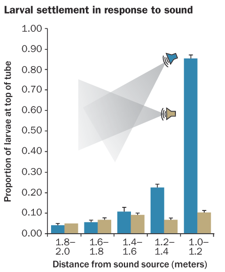Each tube was positioned at a different angle relative to possible environmental cues such as water currents and the reef itself. Regardless of the orientation, though, the majority of larvae crowded into the end near the sound. In a tougher test, the researchers repeated the experiment with speakers raised above the tubes of larvae. Even though tiny corals normally sink downward to settle, the majority of larvae in tubes reversed the normal preference and clustered on the tube’s ceiling. Sound appears to be an overlooked cue for determining where corals settle, Simpson and his colleagues report.