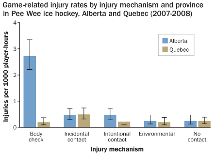 There were 209 injuries, including 73 concussions, during games involving the Alberta players. The Quebec teams, which don’t allow checking, suffered 70 game-related injuries, of which 20 were concussions. Doctors verified the injuries. Among the Alberta players, checking was involved in the majority of injuries, the data show.