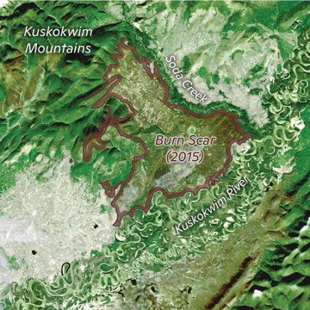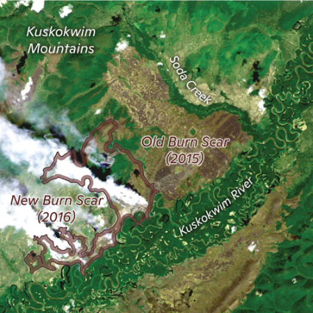 Zombie fires persist underground through winter, emerging the next spring near the previous year’s burn. Here, the area burned by a 2015 Alaska forest fire is outlined in a satellite image. The fire went dormant that winter (shown in April 2016), and reemerged in May 2016 close to the old burn scar (outlined).