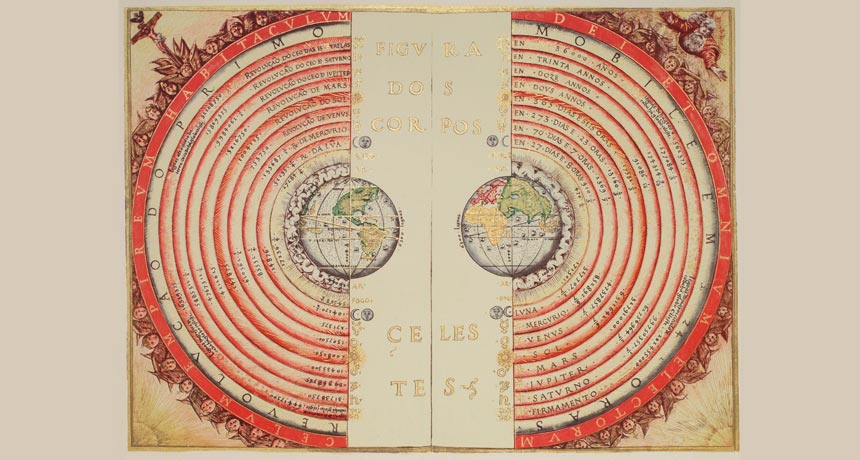 Many medieval scholars accepted Claudius Ptolemy's geocentric model of the universe — shown here in a 1568 illustration by Portuguese cartographer Bartolomeu Velho — an idea that persisted into the 17th century. But Ptolemy's questioning of whether math is useful for predicting observations or if it inheres directly in physical reality is an issue that resonates in today's debate about the quantum wave function.