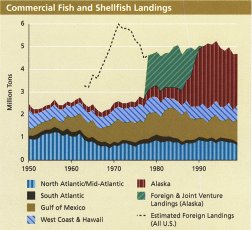 For instance, the new report finds that among fish stocks for which the number of animals is known, 40 percent of the populations have declined over the past 2 decades, and 20 percent have increased. But the study offers an important caveat: “Population trends are not known for three-quarters of commercially important stocks.” Similarly, while the total catch of fish from U.S. waters has remained stable in recent years (see table), such cumulative totals don’t highlight the extent to which this reflects working harder (i.e., spending more time at sea per ton hauled in) or accepting catches of less desirable species–such as dogfish (shark) instead of Atlantic cod.