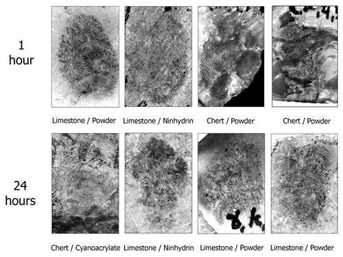 Detailed prints, good enough to run through the Automated Fingerprint Identification System, or AFIS, emerged for 40 percent of the limestone samples and nearly 60 percent of the chert samples that were tested with magnetic powder within an hour of being handled.