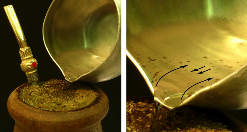 When pouring clean water into a cup filled with tea leaves, some leaves glide upstream into the kettle thanks to differences in the water’s surface tension.