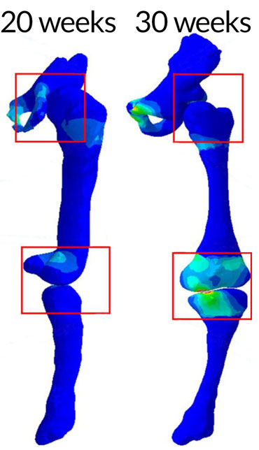 Along with bioengineer Niamh Nowlan, of ICL, and colleagues, Verbruggen analyzed videos of fetal kicks caught on MRI scans. These scans, from multiple pregnant women, included clear leg kicks at 20, 25, 30 and 35 weeks gestation. Other MRI scans provided anatomical details about bones, joints and leg sizes. With sophisticated math and computational models, the researchers could estimate the strengths of the kicks, as well as the mechanical effects, such as stresses and strains, that those kicks put on fetal bones and joints.