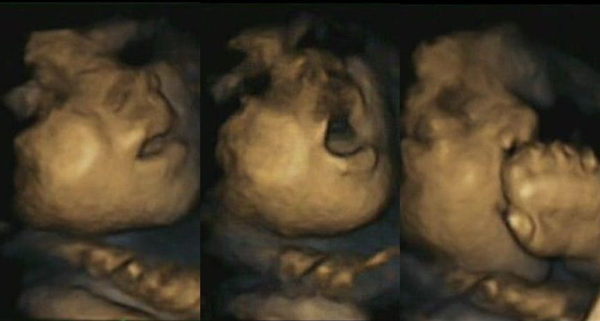 This 32-week-old fetus’ mouth opens in anticipation of a touch, a purposeful movement that may form the basis of feeding behavior later.