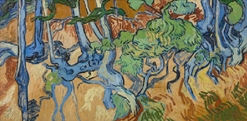 In the absence of eye-tracking technology, I just asked my daughter what she saw. She started by naming colors: “Blue, green, brown.” After she ran through all of the hues, I asked if she saw anything else. She paused, considering the image carefully. “Is it dinosaurs?” she asked. I told her that it’s a painting of tangled, blue tree roots in the ground. “But that green part looks like a Tyrannosaurus,” she told me. As her little finger gestured toward my computer screen, I saw what she meant: A green T. Rex head, rising majestically from the roots.