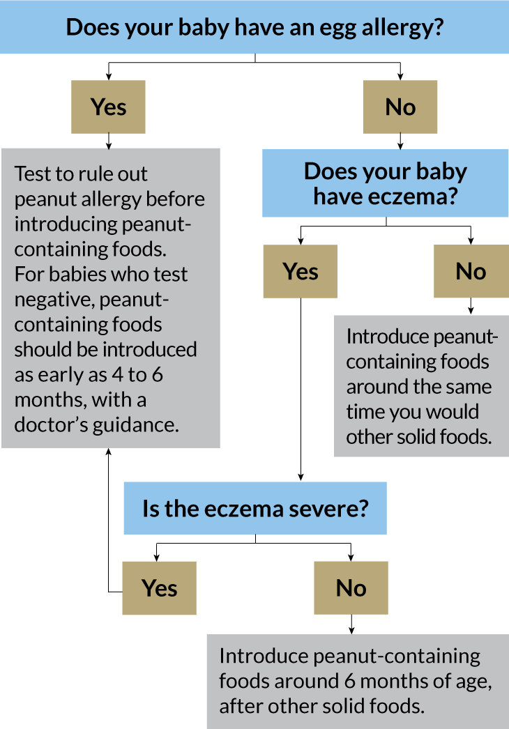 Babies with severe eczema and/or an egg allergy should be tested to rule out peanut allergy. If the test is negative, peanut-containing foods get a tentative green light. A doctor can help parents decide if the baby should be fed in the office, or at home with some instructions.