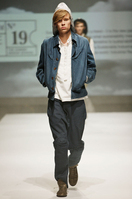 Pieces are also sort of unisexual, eliminating the need for having separate men’s and women’s departments in a store. One rack serves all, although the designers emphasize that their goal is not to dress men and women identically. In fact, each piece would have self-tailoring elements. By snapping, zipping, pulling draw strings or layering pieces differently, each gender could get its own look. Once again, the idea showed imagination and possibilities. By contrast, the actual execution was almost boring. There was what looked like a jacquard navy-blue cape over a light teal shirt. Tight cream and blue knit pants – they could almost be leggings – completed the ensemble. At least the fabric here looked substantial and comfortable.