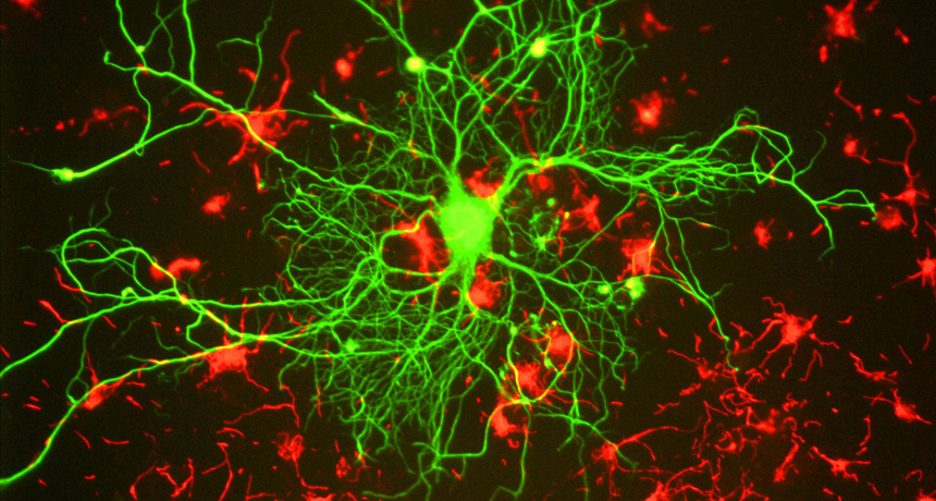 Neurons like this one (green) can become active in times of stress. A new study in mice shows that the connections a neuron develops could make the difference between shrugging off stress and entering a depressive episode.
