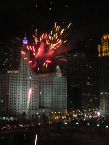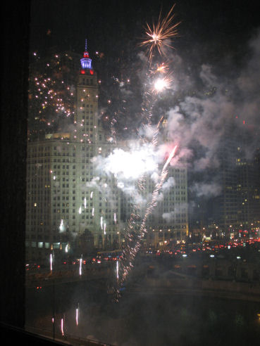 I was in my hotel room at 6:30 this evening, going over my notes from an interview a half hour earlier, when I heard a racket outside. I went to the window and stood transfixed. A steady stream of fireworks was shooting up from the banks of the Chicago River, just beneath my window.