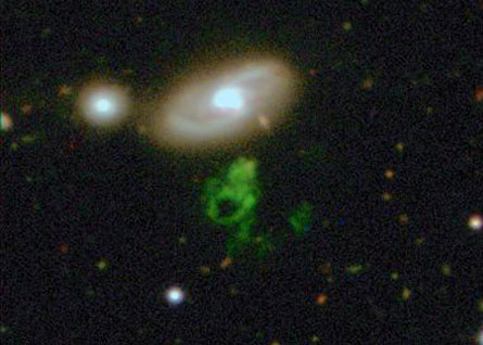 To depict what galaxies and other objects should look like to the naked eye, the Sloan digital photographs have relied primarily on the output from three of its five filters: the green, red, and near-infrared ones. Most times, this combo will give you a pretty good approximation. But Keel found that the new celestial object emits most of its visible light at a very green wavelength (about 5,200 angstroms).