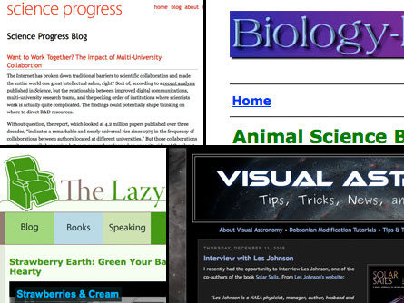 SCIENCE PROGRESS. This blog’s founding proposition: “that scientific inquiry is among the finest expressions of human excellence, that it is a crucial source of human flourishing, a critical engine of economic growth, and must be dedicated to the common good. Scientific inquiry entails global responsibilities. It should lead to a more equitable, safer, and healthier future for all of humankind.” High aspirations, and a site with posts from some noted science journalists, including Rick Weiss (formerly of the Washington Post — and, before that, Science News). This site is hosted by Weiss’s new home: the Center for American Progress, a politically oriented think tank (that is left-leaning, if you care about such things).