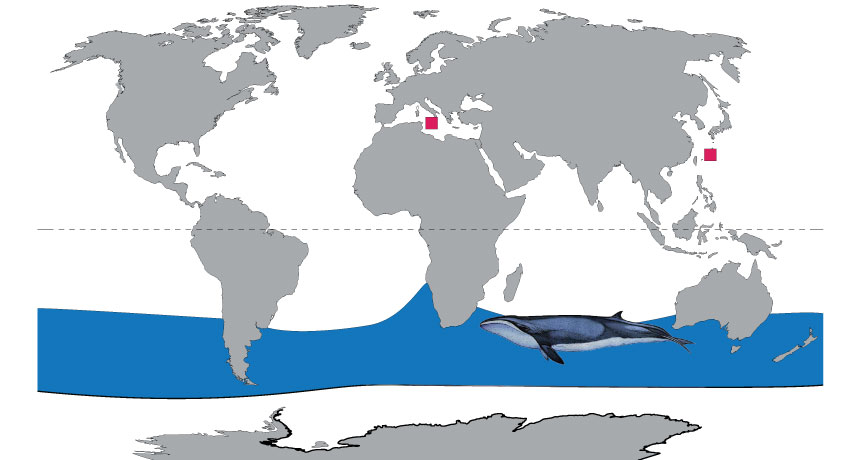 WHALE WATCH Today, pygmy right whales live in the Southern Hemisphere (the range highlighted in blue). But two new fossils (red squares show where they were found) suggest that the species lived for a time in the Northern Hemisphere.
