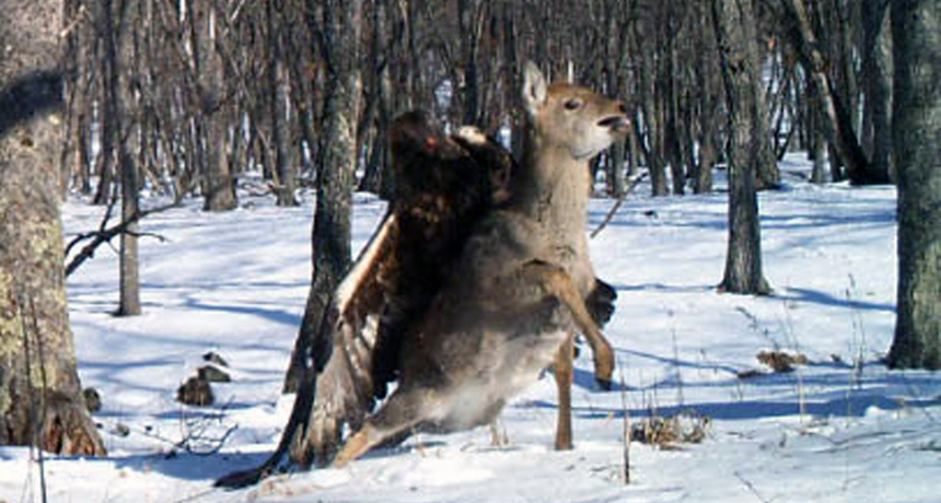 DEER VS. EAGLE A camera trap solved the mystery of a deer carcass discovered in the snow. It was killed by a predator that left no tracks.