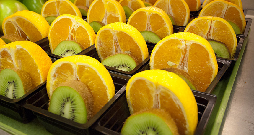 Fresh orange and kiwi fruit cups are prepared for the National School Breakfast Program. Serving the meal in the classroom boosts participation rates and attendance.