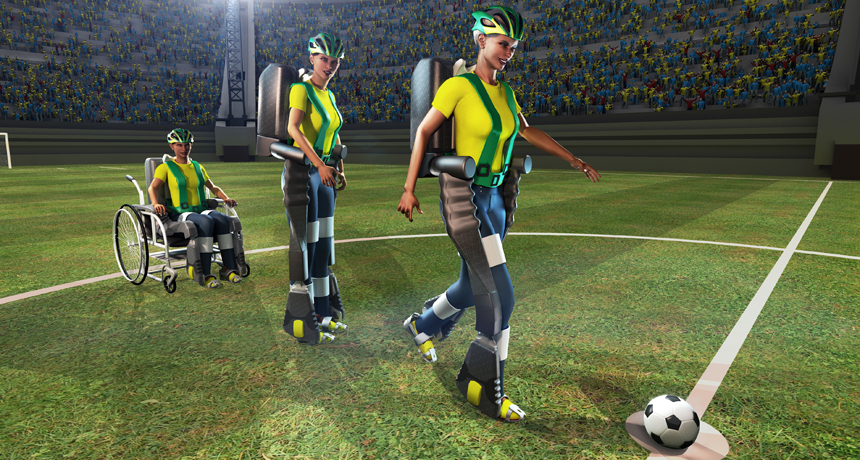 A brain-controlled exoskeleton, shown in this artist's illustration, helped a paralyzed person make the first kick at the World Cup.