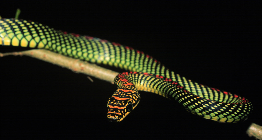Vortices, or whirls of wind, around the flattened body of a paradise flying snake (shown) give it extra lift as it undulates through the air.