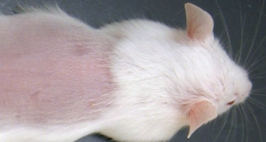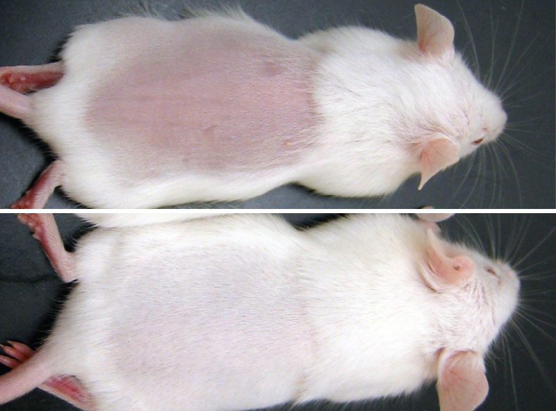 Adult mice that have the gene Lin28a reactivated regrow thicker hair and skin in shaved areas compared with shaved adult mice that do not have the gene turned back on (one shown).